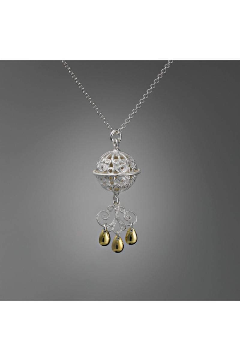 Komsekule med fint filigransarbeide, med et hengende filigran løv - inspirert av tradisjonellt bunadsølv.