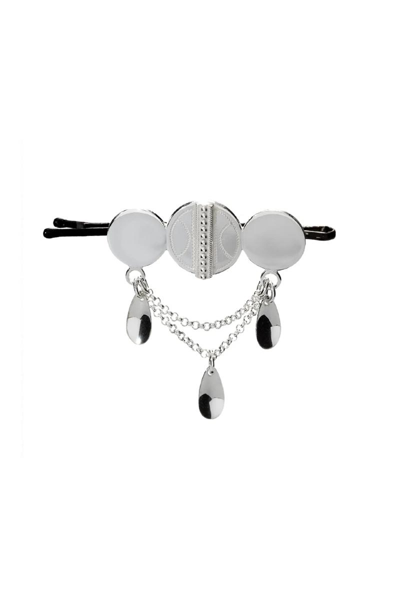 En hårspänne inspirerad av samisk klänning i silver och kvinnans bältes knappar.Mått: ca. 40 mm bred, 16 mm hög.