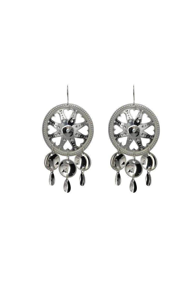 Váibmu betyder hjärta på nordsamiska. Örhängena har utsågade hjärtan i mitten, en cirkel formad av silvertråd, handstansat och graverat mönster.3 hängande blad med silverdroppar.