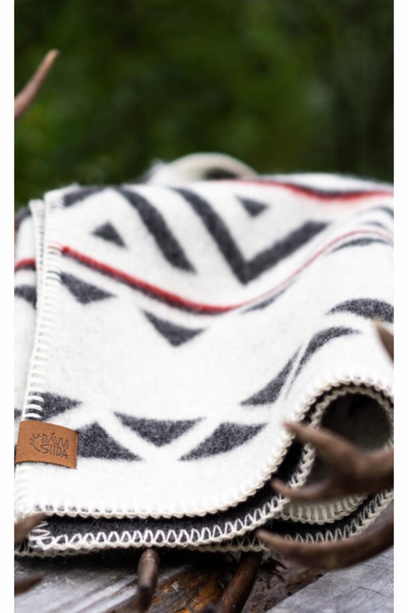 Fargekombinasjon: Pleddet er grå på en side og hvit på den andre siden, med røde border på begge sider.
